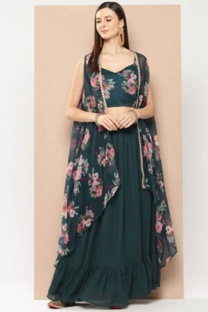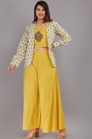 Women Printed Cotton Crop Top And Palazzo With Jacket Set
