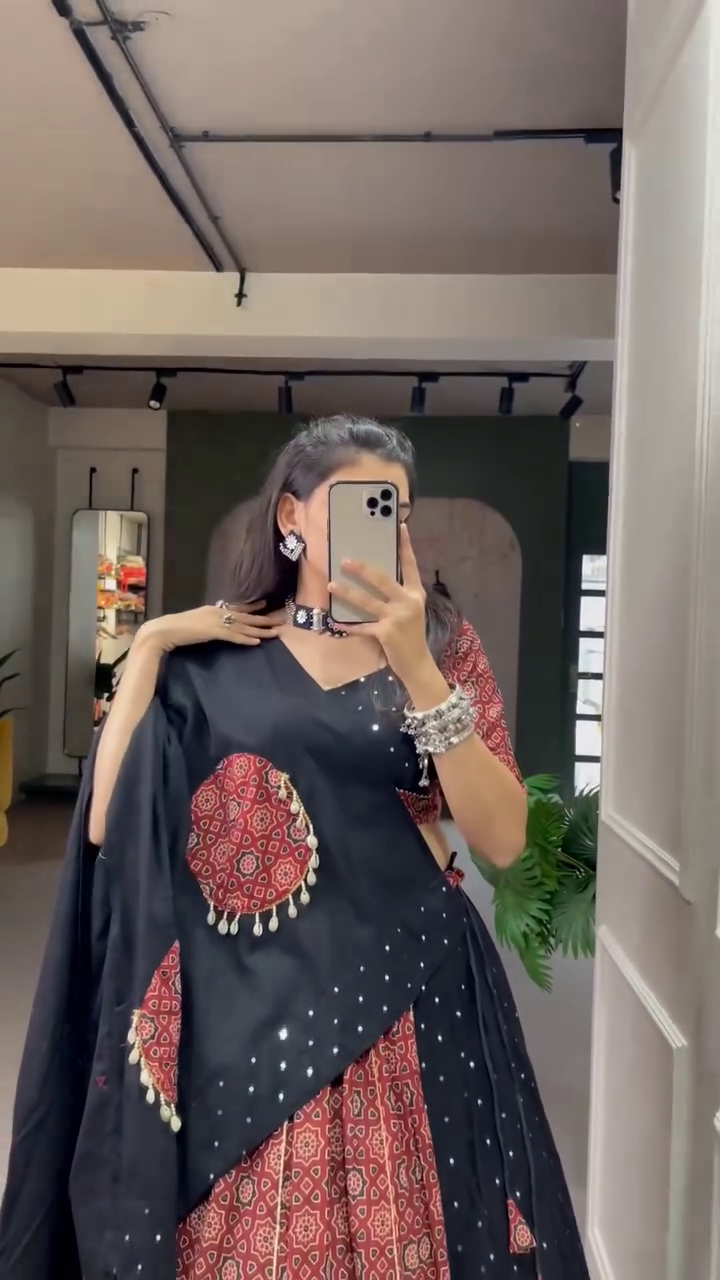 Designer Lehenga Set: Includes a printed lehenga skirt, contrasting blouse, and mirror work dupatta.