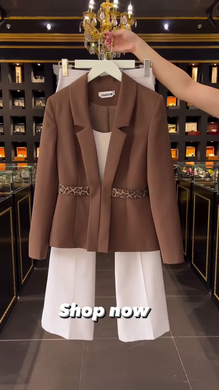 Contrasting Two-Tone Aesthetic: The deep chocolate brown of the jacket creates a rich visual contrast against the crisp ivory of the trousers, offering a fresh take on neutral-toned dressing.