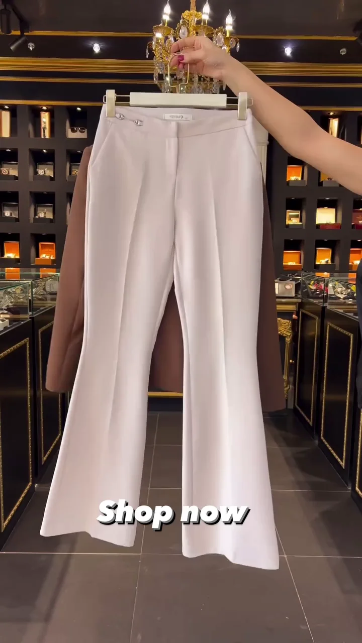 High-Waist Flare Silhouette: The ivory trousers are designed with a high-rise waist and a dramatic flare from the knee, creating the illusion of elongated legs.