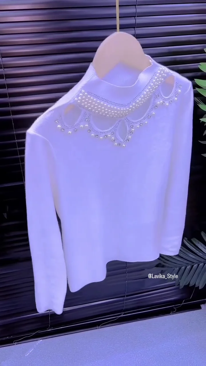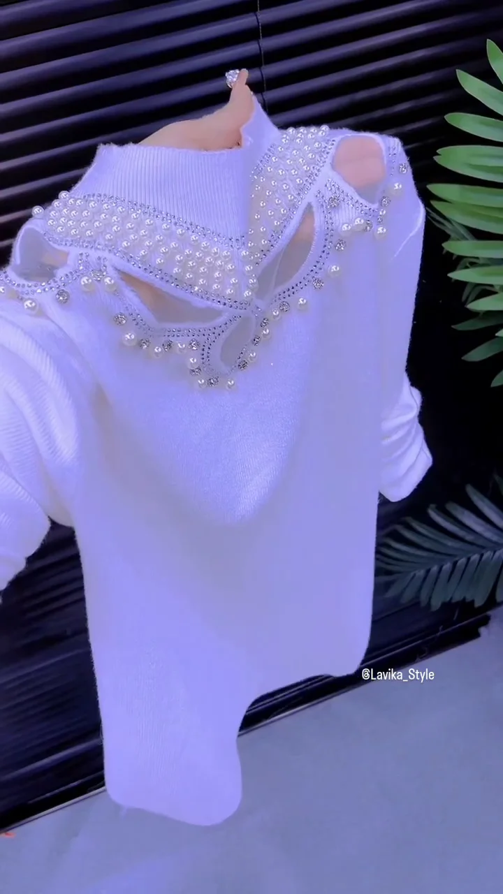 Elegant White High-Neck Knit Sweater with Dramatic Pearl and Rhinestone Scalloped Cutout Neckline Detail