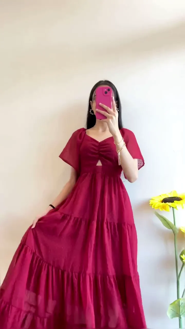 • Maroon Puff Sleeve Maxi Dress ? Designed with stylish puff sleeves, a ruched bodice, and subtle cut-out details, offering a feminine and flattering silhouette.
