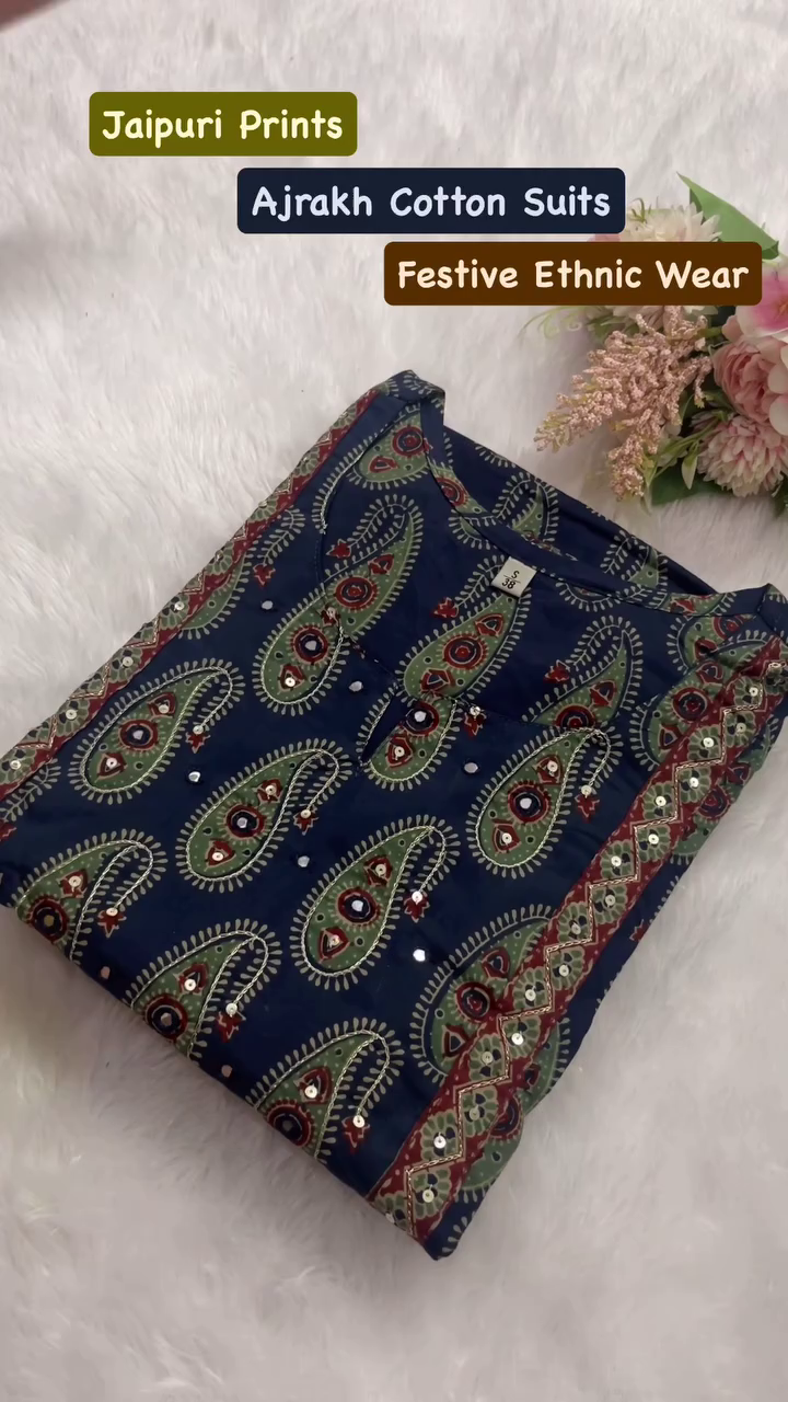 Color & Print: Rich navy blue base adorned with traditional Ajrakh paisley prints