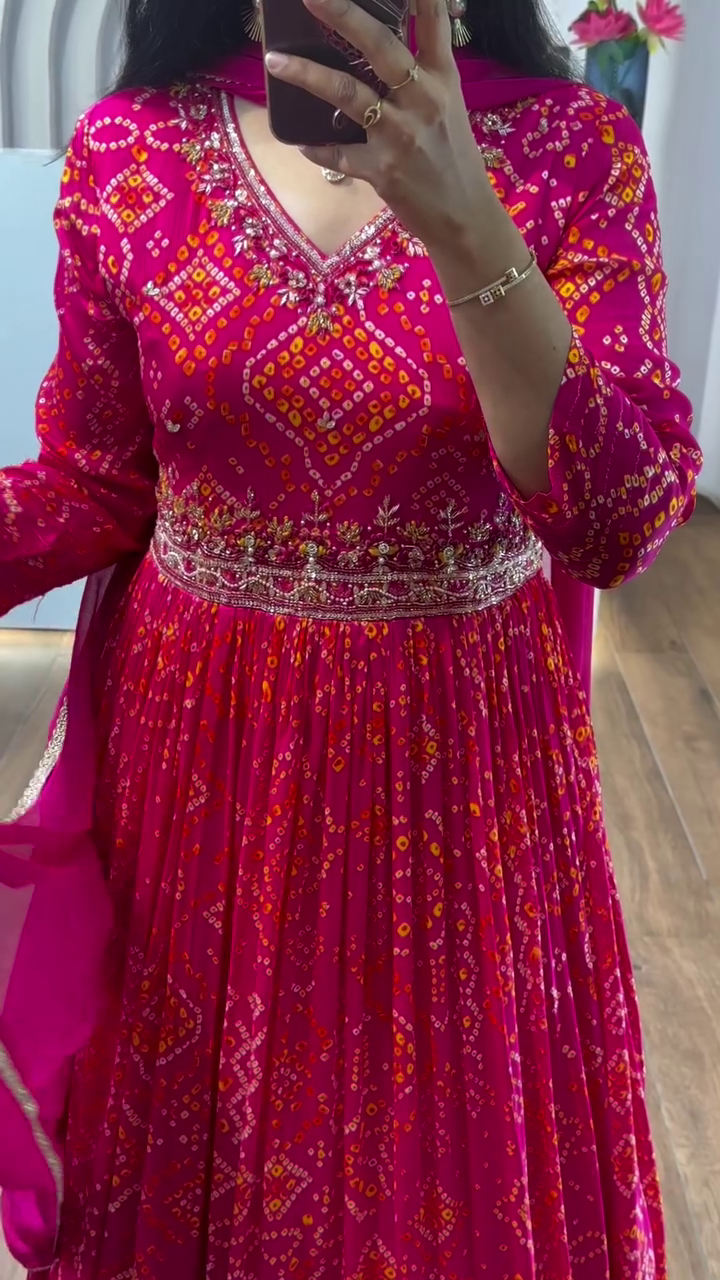 Style Highlight: The Bandhani pattern with an embroidered belt adds a modern twist to a traditional Anarkali suit, making it a standout festive ensemble