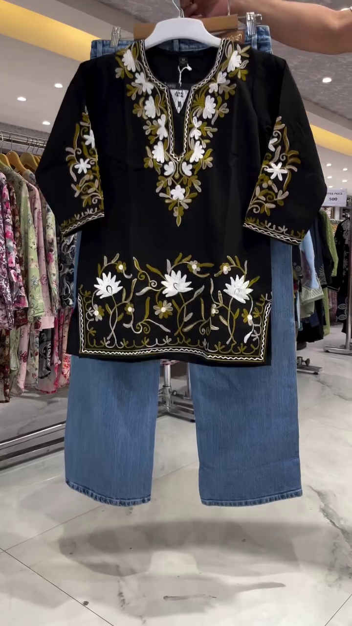 Style Highlight: The contrast of embroidered black kurti with trendy blue wide-leg jeans makes it a smart, youthful, and fusion-ready outfit