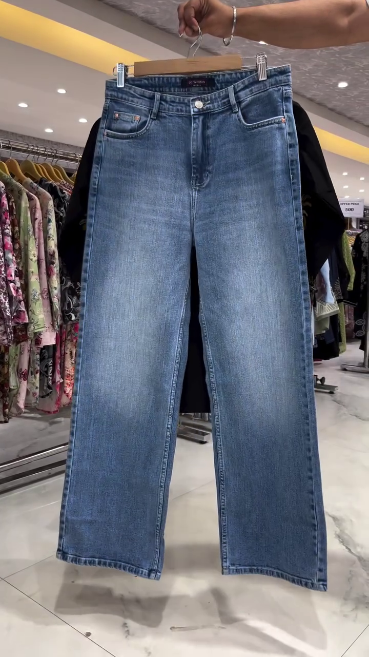 Paired with blue wide-leg jeans for a chic, contemporary look