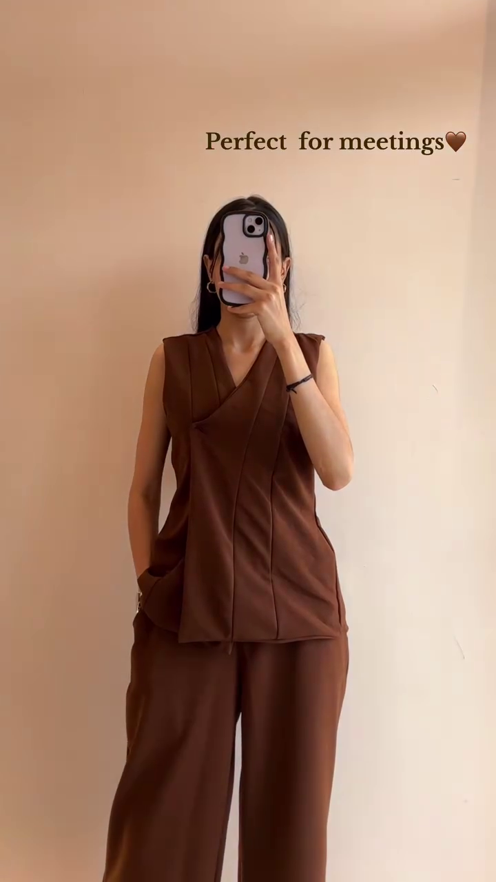 Trendy Co-ord Set Collection ? Includes two stylish co-ord outfits: a printed oversized t-shirt with relaxed fit pants for casual comfort, and a chic brown sleeveless overlap top paired with wide-leg trousers for a polished formal look.