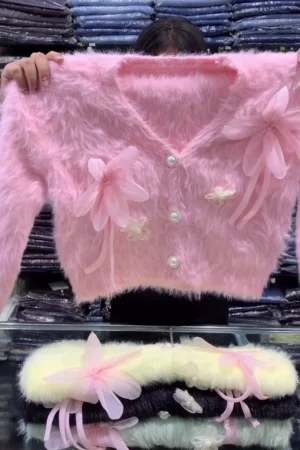 Charming and Soft Mock-Neck Sweater with Whimsical Embroidered Forest Motif Featuring a Cartoon Rabbit, Mushroom, Acorn, and Trees, Available in Light Pink, Blue, and Black
