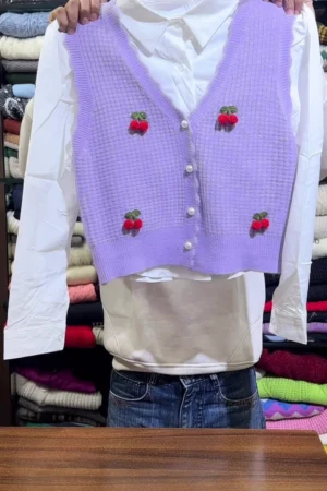 Preppy and Cute Cropped V-Neck Knit Sweater Vest with Scalloped Trim, Embellished with 3D Cherry Appliqués and Pearl Buttons, Shown Over a White Collared Shirt