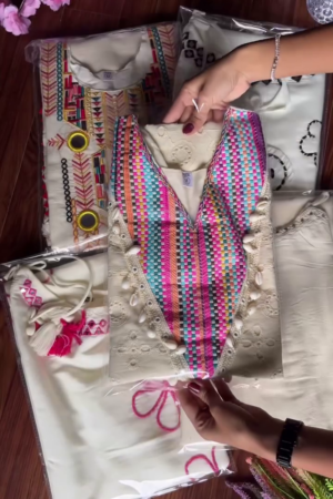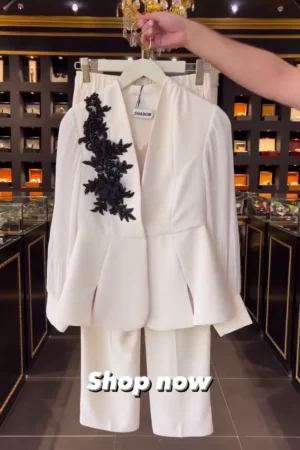 Elegant Cream Peplum Trouser Suit with Intricate 3D Floral Embroidery and Pleated Accordion Sleeves