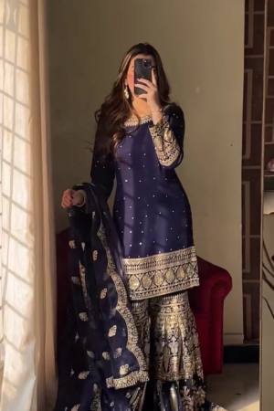 Elegant Navy Blue Anarkali with Sequins and Mirror Embellishments