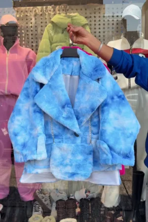 Vibrant Faux Fur Jacket and Matching Chain Bag Set Featuring Bold Tie-Dye Print, Wide Notched Lapels, and Oversized Cuffs in Pink/Purple and Blue Ombre Shades