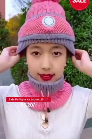 Ultimate 3-in-1 Winter Knit Set: Fleece-Lined Beanie Hat with Faux Fur Pom-Pom, Detachable Button Face Mask/Balaclava, and Adjustable Neck Warmer in Pink and Gray Color Block