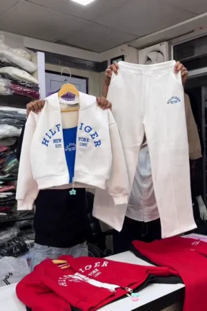 Branded New York Style Activewear Tracksuit Set featuring Cropped Zip-Up Hoodie Jacket and Wide-Leg Drawstring Sweatpants with Embroidered Logo in White and Bright Red