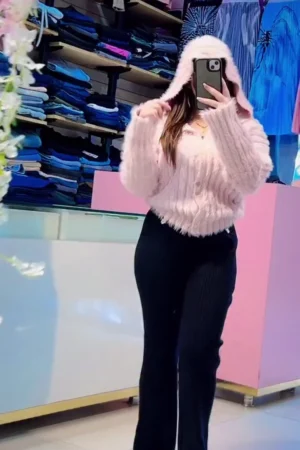 Two-Piece Winter Outfit Set Featuring a Soft Pink Cropped Shaggy Cardigan with Hood and Front Button Closure, Paired with High-Waisted Ribbed Knit Flared Trousers in Black for a Cozy and Trendy Look