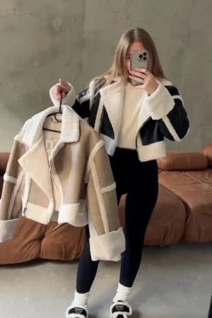 Trendy Cropped Faux Leather and Faux Shearling Aviator/Biker Jacket with Wide Collar and Asymmetrical Zipper in Black and Beige Colorways