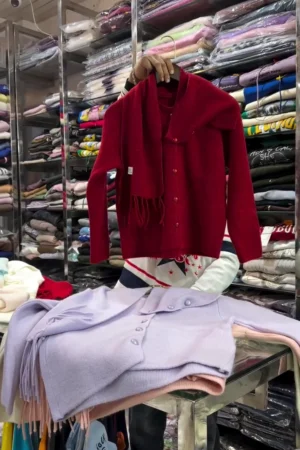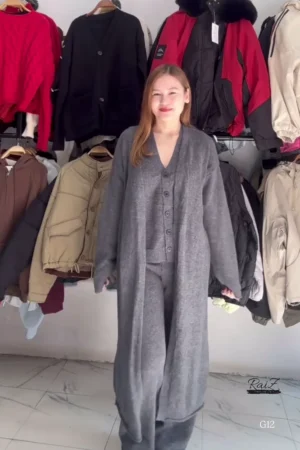 Women’s Soft Gray Knit Lounge Set – Includes Full-Length Cardigan, Front-Button Vest, and Wide-Leg Pants – Comfortable and Elegant Knitwear Ensemble for Relaxed Days and Stylish Outings