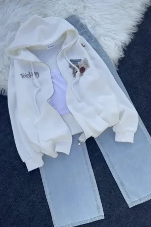 Casual Zip-Up Hoodie Sweatshirt Featuring Drawstrings, Ribbed Cuffs, Embroidered ‘Tricking’ Text, and Unique Patch Details, Available in Solid White and Deep Maroon for Trendy Layering