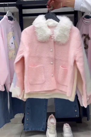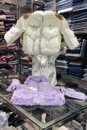 Chic Faux Leather & Faux Fur Panel Jacket – Cropped Biker Style Outerwear with Soft Shaggy Fur Body and Sleeves, Zippered Front Closure, and Dual Chest Pockets – Available in Cream White and Pastel Lavender Purple.