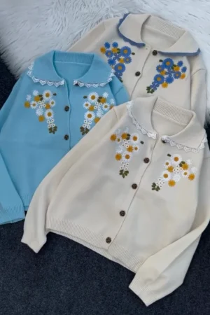 Lightweight Long Sleeve Knitted Cardigan with Vintage Floral Design and Button Front